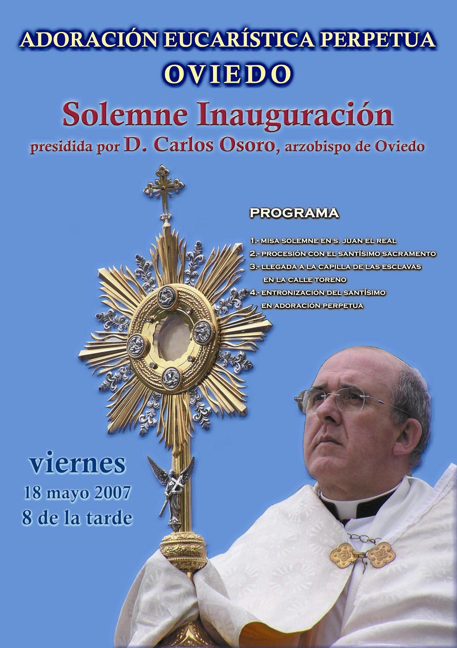 de una homilía del Domingo VI de Pascua-Año C) Es el Espíritu Santo quien le confiere unidad a nuestra adoración y hace no sólo adoradores –esos que adoran a Dios en espíritu y en verdad- sino también que hace a la comunidad adorante. Es el Espíritu quien nos une en una fraternidad eucarística de adoración. La Adoración Eucarística Perpetua es la fraternidad eucarística de aquellos adoradores que no dejan de adorar a su Dios y Señor, día y noche. Él es Dios, eternamente Dios, que nos ama de amor eterno. Él ha venido a plantar su Morada entre los hombres. Nosotros respondemos en el tiempo, adorándolo sin cesar. La Adoración Perpetua es querida por Dios. Esto no sólo lo demuestra nuestra experiencia sino, por sobre todo, el Espíritu Santo que inspira al Magisterio de la Iglesia, porque el Magisterio recomienda la Adoración Perpetua (Redemptionis Sacramentum, Sacramentum Caristatis). La Buena Noticia es que la Adoración Perpetua es ya realidad en Oviedo, puesto que el 18 de mayo empezamos. A partir del 18 la profecía del Apocalipsis, que acabamos de oír, se hará realidad de la gracia, porque “la gloria de Dios iluminará a la ciudad y su lámpara será el Cordero”. Nuestro Señor Jesucristo, desde su presencia eucarística, expuesto día y noche a la adoración de sus fieles, en las Esclavas, irradiará sus bendiciones, su luz, su paz sobre cada adorador, sobre su familia, sobre su ciudad. “La paz os dejo”, dijo el Señor. La paz de Cristo sobre Oviedo! |