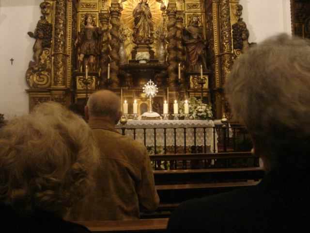 Fue una noche maravillosa, inolvidable. Todos estábamos de fiesta, algo muy grande se avecinaba y todos colaboraron. Era el comienzo de la Adoración de la Eucaristía día y noche y todos estuvieron, unos en persona y otros representados tan estupendamente por las personas del protocolo. Todos se volcaron embelleciendo el entorno para tan solemne día y en una mañana, convirtieron el patio en un jardín iluminado, lindo y bello, engalanado con los mil colores de tantas flores, para acoger y acompañar día y noche al Señor de los señores, al Rey de reyes. La belleza de aquella tarde estaba asegurada por el cariño y el amor que se respiraba en Cancelada. Todos estábamos impacientes, mirando al cielo que de pronto cambió su color azul mediterráneo y comenzó a destilar un agua de lluvia fina, la que cala y penetra la tierra y hace que se abran las flores y los frutos. Esa lluvia era el anuncio de la gracia de Dios que estaba cayendo sobre Cancelada. Nuestra iglesia, la más pequeña y humilde de toda la Costa del Sol abrió sus puertas pero era insuficiente para acoger a todos, de modo que muchos estaban bajo la lluvia. Los niños de la catequesis, vestidos de auténticos hebreos, nos hicieron una catequesis viviente sobre la Eucaristía. Todo ello precioso con el encanto propio de los niños. El párroco expuso el nacimiento y la génesis de la Adoración perpetua en la parroquia, y el Sr. Obispo nos dio una plática muy bonita animando, bendiciendo y apoyando esta iniciativa tan maravillosa. A continuación tuvo lugar la primera hora santa presidida por el Sr. Obispo y por el párroco con gran afluencia de fieles que abarrotaban el interior y el exterior bajo la lluvia. Breves reflexiones, cantos preciosos, música de órgano y silencios nos llenaron el corazón. Todo ello es un motivo de agradecimiento e invitación a asomarse a la iglesia de Cancelada que desde el 27 permanece abierta día y noche para adorar al Señor de los señores. El Sr. Obispo firmó una dedicatoria muy bonita con la que se abrió el Libro de Oro de la Adoración: “Una tarde-noche del año 2004, un grupo numeroso de cristianos de la parroquia de Cancelada (Estepona) con su cura al frente, cansados de tanto ”silencio de Dios” pusieron sus ojos en el sagrario de la iglesia y señalando con el dedo, gritaron con fe firme: ”Dios está aquí, VENID ADORADORES ADOREMOS A CRISTO REDENTOR”, y con fe viva se lo creyeron. Y así surgió una historia de amor apasionante entre Dios y estos hombres y mujeres: LA ADORACIÓN EUCARÍSTICA PERPETUA. La experiencia de un pueblo que Dios le ama y que no tolera que Dios esté solo. Que el Señor bendiga con su gracia esta extraordinaria iniciativa de una gente que se cree que Dios existe, y que ESTA AQUÍ. Ha puesto su morada entre nosotros. “Cantemos al amor de los amores.”